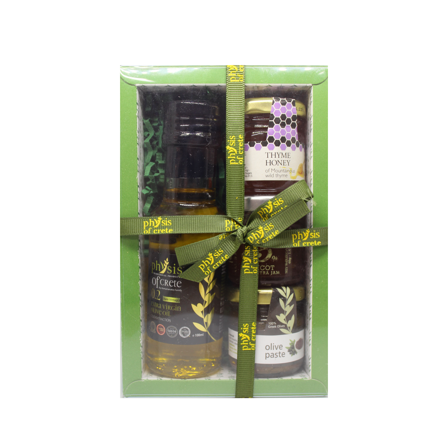 Σετ δώρου με 100ml εξαιρετικό παρθένο ελαιόλαδο, 40γρ Κρητικό μέλι, 40γρ πάστα ελιάς, 40γρ μαρμελάδα